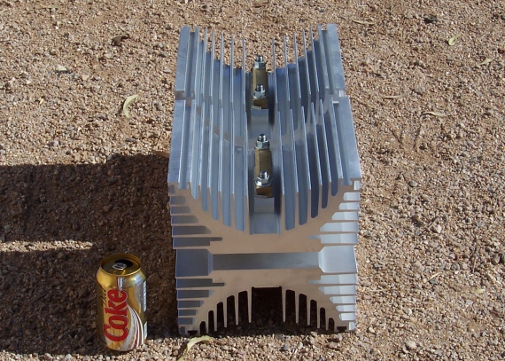 June 20, 2006 The Heatsink from Hell So, the title on the eBay auction was "Large Rectifier", and sure enough the photo showed what appeared to be two fairly large heat sinks with a couple of stud-diodes bolted inbetween. The opening bid was $0.99 and the seller was nearby (no shipping) so I bid a dollar. What the heck. Well I won it. When I went to pick it and a dozen other lots up the girl rolled all of my other stuff out on a cart, and then asked me if I'd mind going back into their warehouse and getting the rectifier myself. I went and found it. While I could lift it, I couldn't carry it any distance! I dug up a hand cart and got the box into my van and got it home. Back at the ranch I wrestled the thing out of its box and it looked exactly like the picture in the eBay auction except that it was easily 4 TIMES bigger than I had thought! It is 14" by 10" by 10", and according to my bathroom scale weighs in at 72 pounds. (It actually dented the scale ... Lisa's gonna kill me) The device is actually three heatsinks with 2 gigantic diodes between them making a half-wave bridge. There are no part numbers or clues on the assembly that I could find on the web, but I did look up the part numbers on the diodes (SW14CXC14C). Now, I've used a lot of diodes in my time, and have designed and built plenty of power supplies, but ... 1400 VOLTS AT 3270 AMPS ?!?!?! YIKES! That's ... um ... P=IxE .... where's my calculator? ..... 4578000 Watts? ... 4.6 MEGAWATTS??!! Somebody tell me I'm doing my math wrong! Cool as that may be, I don't see "build a power supply for a nuclear submarine" anywhere on my honey-do list, so what the heck am I going to do with it? 70 pounds puts it well out of the doorstop/book end catagory and I don't have a boat (gratuitous joke for ham radio guys). Since a soda can weighs about a half of an ounce, or 32 cans to the pound, selling it to my scrap metals guy would bring 2,240 brand spanking new Diet Coke cans into the world, and give me about $31 (not bad for a $1 investment). So selling it for scrap is the obvious choice. But I'd hate to do that. I usually find that "obvious choices" are painfully pedestrian. Besides, the thing is cool, and it would be cooler still if I could find someone that could use it as is. I just don't know who that is (DOD? NRC?). So, if you have any bright ideas on how to save this treasure from the recyclers crucible drop me a line at : hbws (at) hackersbench.com John July 15, 2006 Object de' Heatsink Art The saga of the Heatsink From Hell (H.F.H.) continues. I called and had a grand chat with the teacher who oversees the electric car racing team at a local high school. It seems that the motor controllers they use already have all of the heat sinking they need so they really couldn't put it to good use. I also received a lot of emails from folks who begged me not to sell it off for scrap. Most all of them said that they'd love to have it, but no one was willing to pony up a reasonable offer and pay for shipping. I also got a lot of suggested applications in my email, and I'm trying to decide if I should be scared that so many people out there are designing and building high powered rail guns!!! Then there are the laser power supply folks, the 12-pack beer can cooler guy, the Stirling engine crowd, and one email that went on for three pages about 'thermal capacitors' ( which included enough formulas to give me nightmares about high school calculus class). I even got a few emails from ham radio guys who didn't want the heatsink, but just wanted to tell me they 'got' the boat anchor joke. :-) So, no ideas that I can really use, and no one willing to pay a fair price for the H.F.H. so there it sits. I did have a thought, though. I work in a small detached office in my backyard, and I have a new window-style air conditioner to fight the 110 degree days here in Arizona. It hums and blows valiantly, but it has a really hard time getting the space cooled down when it's really hot outside. If I somehow attached the condensing coil of the A/C unit to the heat sink, and added a decent fan, perhaps it would struggle a little less. I need to find an A/C expert. But in the mean time; it's 112 degrees outside, the H.F.H. is too hot to touch without welding gloves, and I'm disinclined to do any real work out there anyway. So there it sits: The 'coolest' lawn ornament in the neighborhood. July 19, 2006 Aire on a Heatsink Damn. While my idea about running the condenser coil of my air conditioner through the H.F.H. would work (according to the guy that installed the 5-ton unit on my house), the cost of tearing apart the A/C unit, adding in the plumbing, and then recharging it would cost a little bit more than replacing my window unit with a much larger (and more efficient) one. A friend of my neighbor wants to bolt it to the trunk lid of her 1971 Buick art car. 8-/ | |