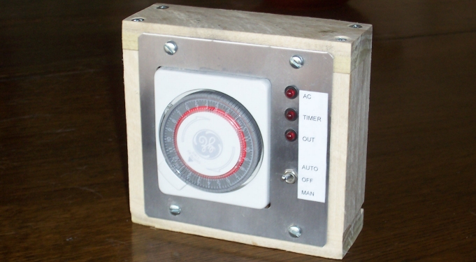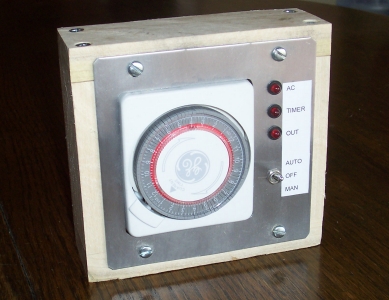 It might look like I want a little "over the top" with this but I had the aluminum plate left over from an earlier project. I cut the plate to size and filed the edges smooth. Then I milled out an opening the same size as the timer and drilled one hole for the toggle switch. I built a simple wooden box but you could use just about any kind of enclosure for this. As always, free or cheap is best, BUT REMEMBER... we're messing with line voltage here and you can kill your self fairly easily. If you're unsure, don't do it, and get someone to help you who knows what they're doing. While I'm thinking about it, here's the legal CYA: If you try to do what I've said here, you will be seriously injured or killed, so don't do it.