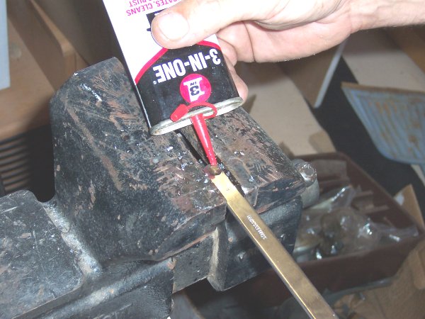 small pilot drill, and you HAVE to use oil. Put another drop on once or twice as you